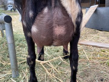 Heidi is incredibly sweet and gentle. She received the great mother gene from her Dam Maybelle Blue and her udder is developing very nicely for a first freshner. Photo of udder is at about a week fresh and with zero sepweration, Very excited to see how she milks.