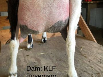Rosemary is a sweet, easy going goat like her mother. Rosemary is a very attentive mother, easy milker, and has a very nice udder.